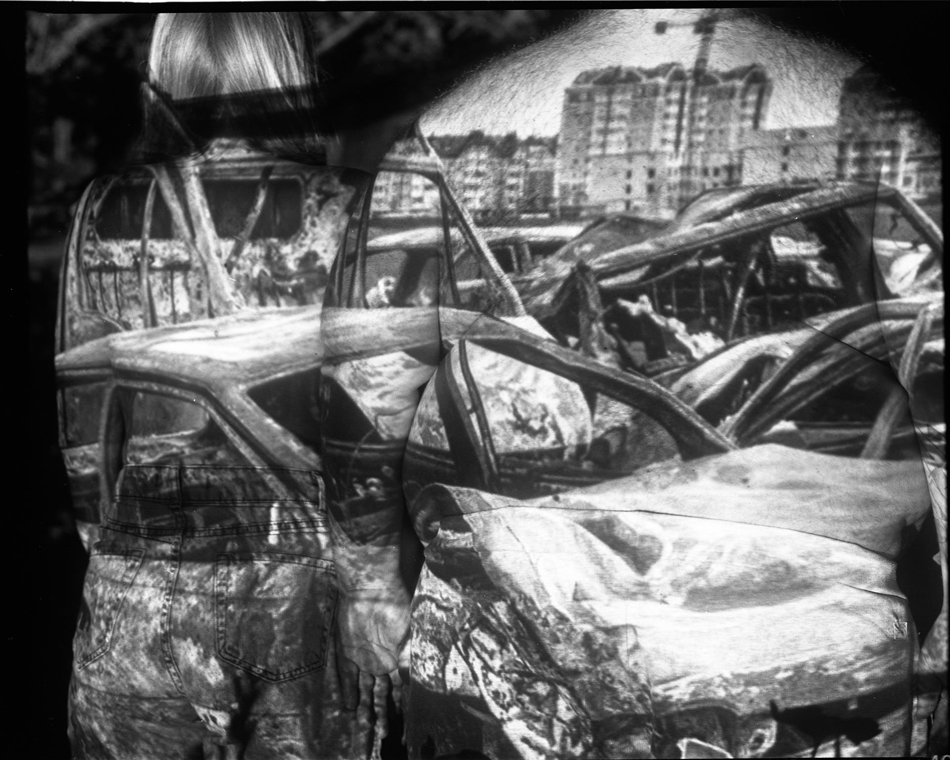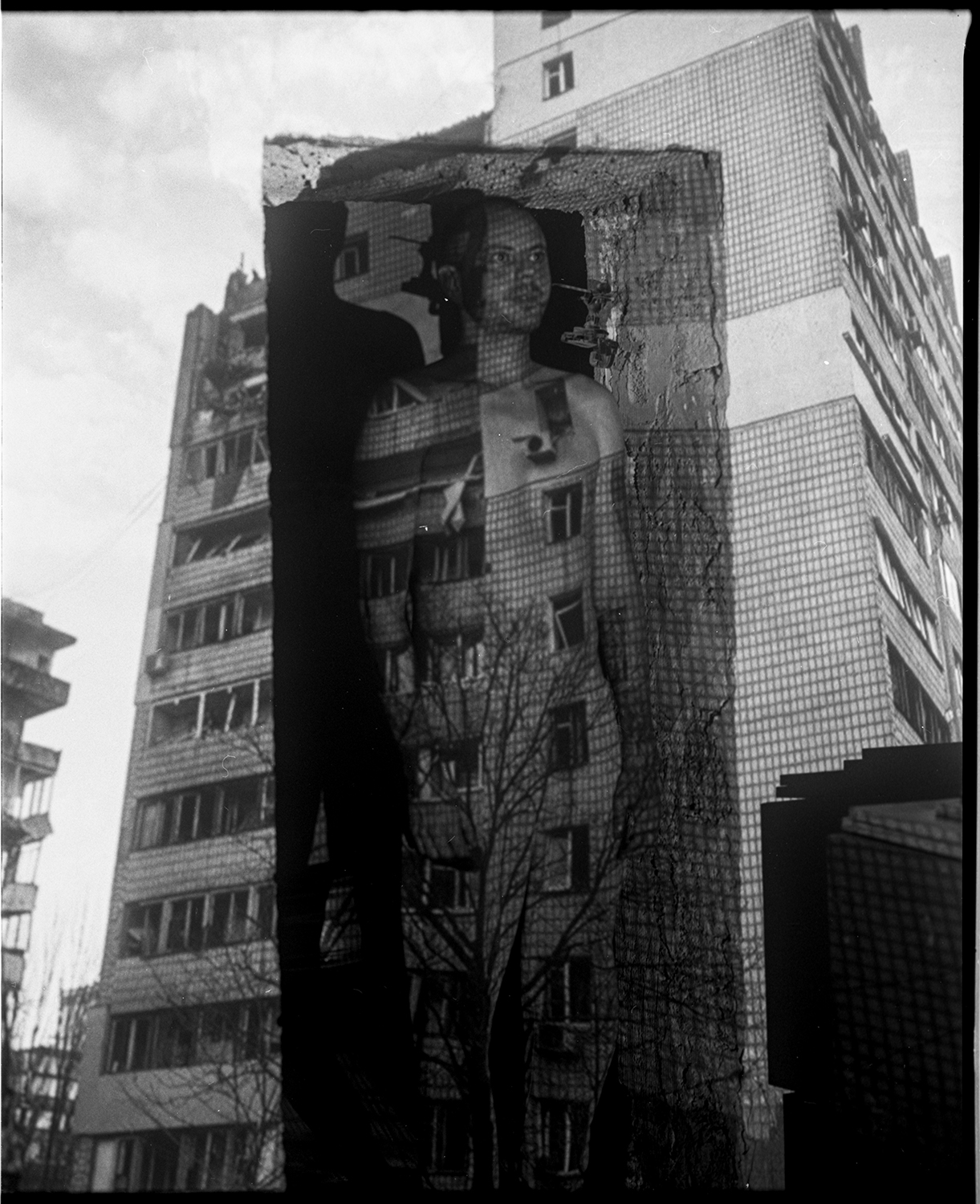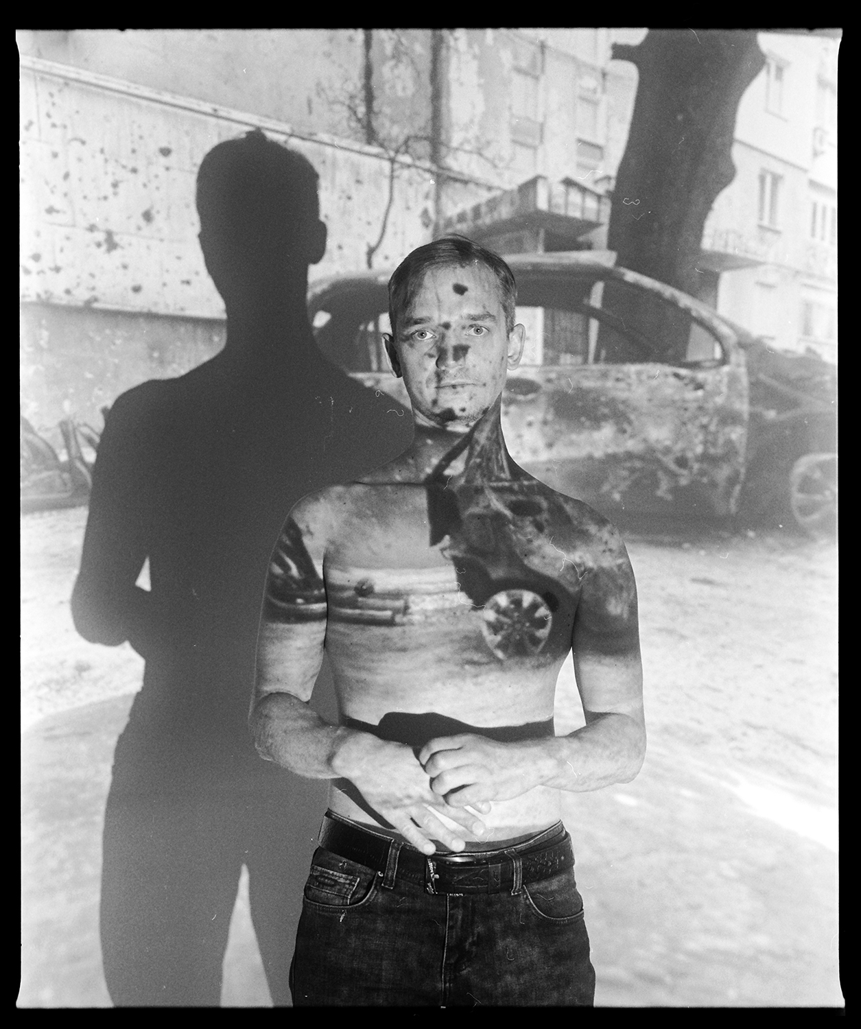 „Tetovaže rata“ istodobno su osobni i kolektivni pokušaj promišljanja rata punog razmjera u Ukrajina. Riječ je o seriji crno-bijelih fotografija u kojima subjekti — uglavnom umjetnikovi bliski prijatelji, članovi obitelji i voljene osobe — stoje pred kamerom s projiciranim slikama rata koje se slojevito preklapaju preko njihovih tijela i lica. Na taj način nastaje novi vizualni sloj: uvjetna „tetovaža“ koja fiksira proživljeno iskustvo i sjećanje, ostajući s osobom zauvijek.