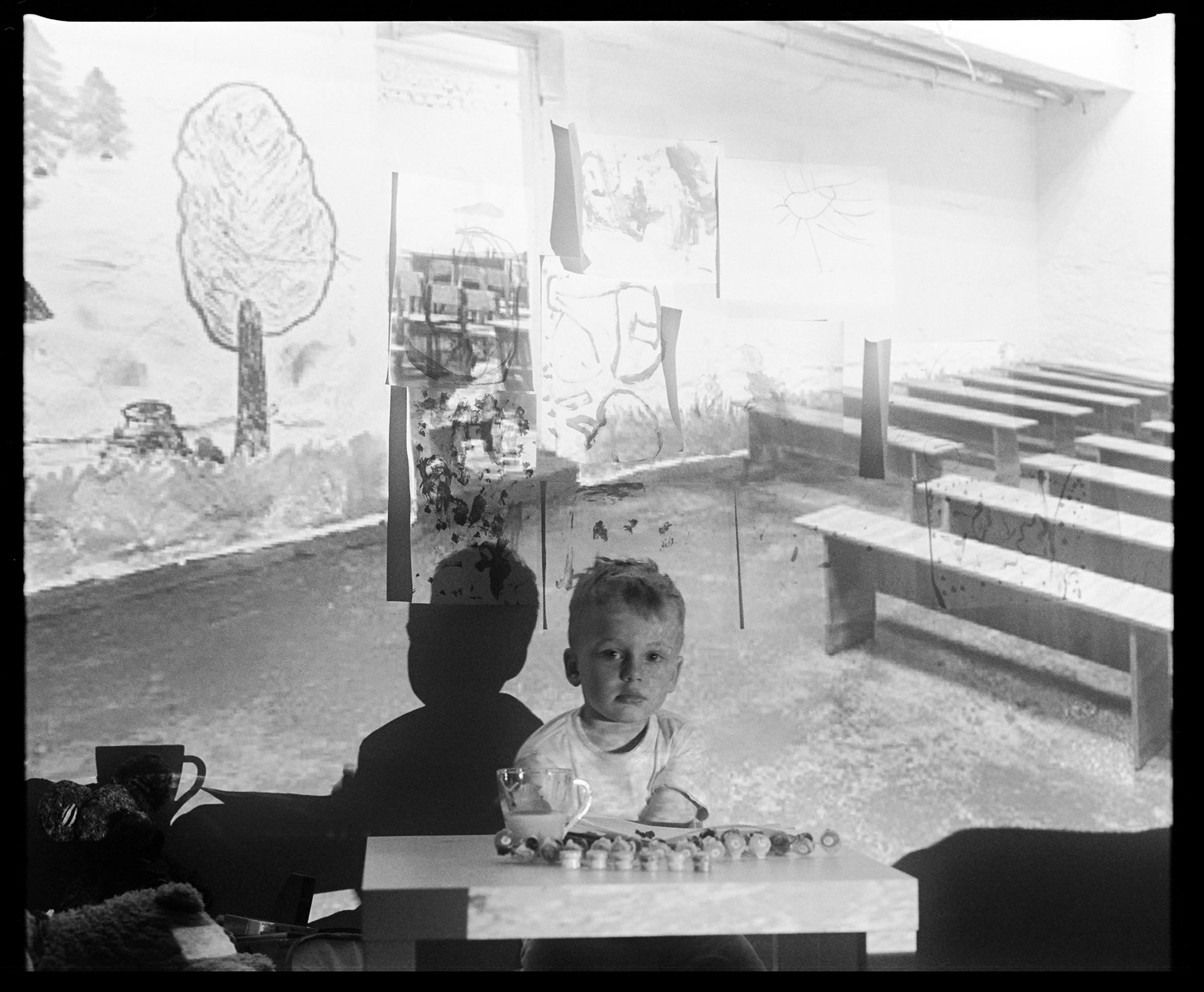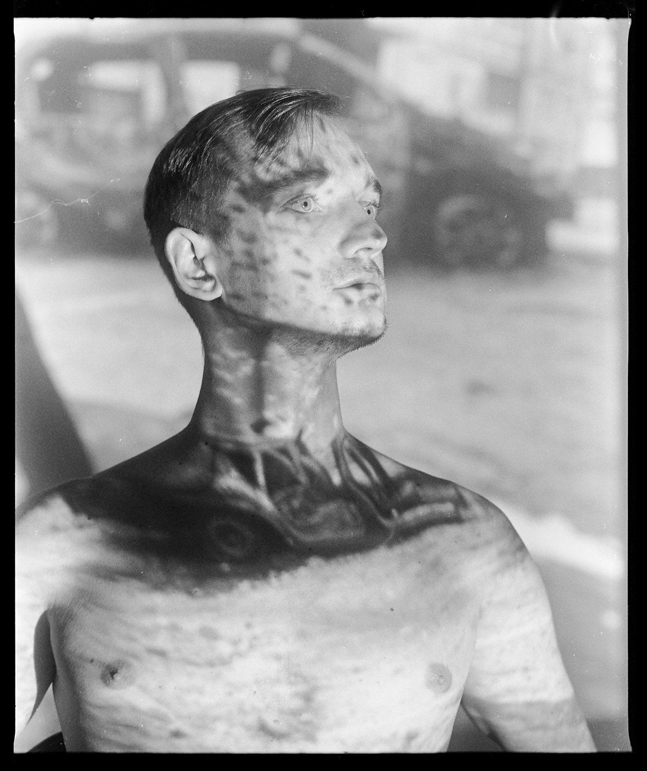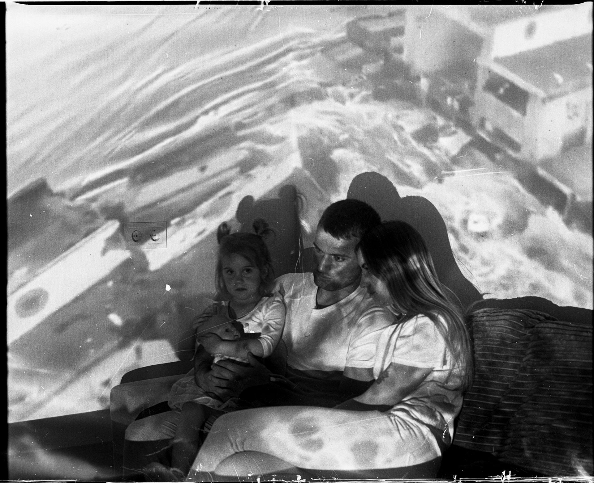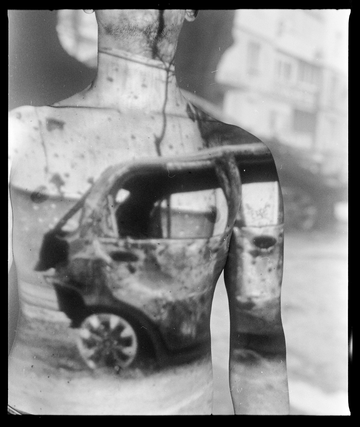 „Tetovaže rata“ istodobno su osobni i kolektivni pokušaj promišljanja rata punog razmjera u Ukrajina. Riječ je o seriji crno-bijelih fotografija u kojima subjekti — uglavnom umjetnikovi bliski prijatelji, članovi obitelji i voljene osobe — stoje pred kamerom s projiciranim slikama rata koje se slojevito preklapaju preko njihovih tijela i lica. Na taj način nastaje novi vizualni sloj: uvjetna „tetovaža“ koja fiksira proživljeno iskustvo i sjećanje, ostajući s osobom zauvijek.